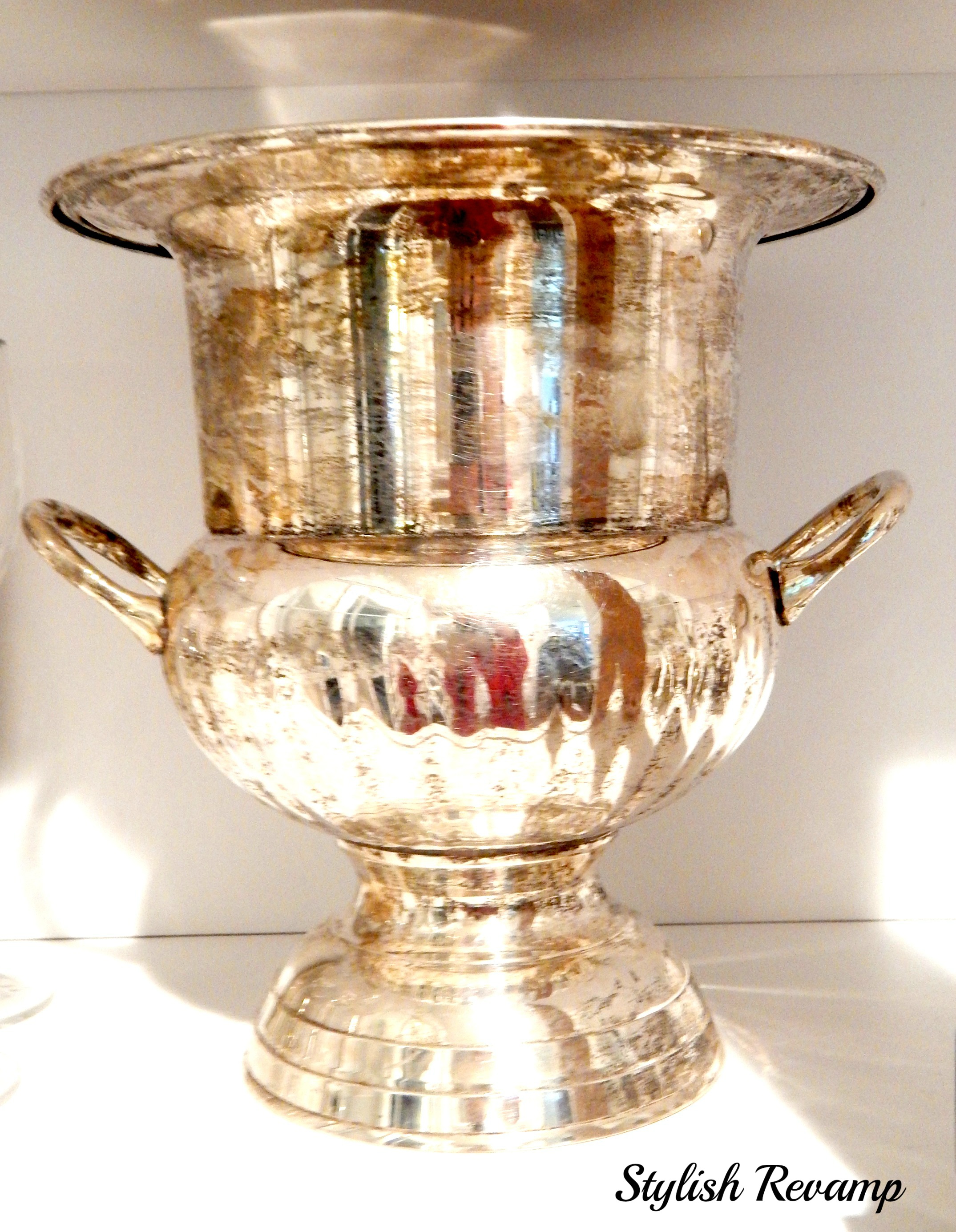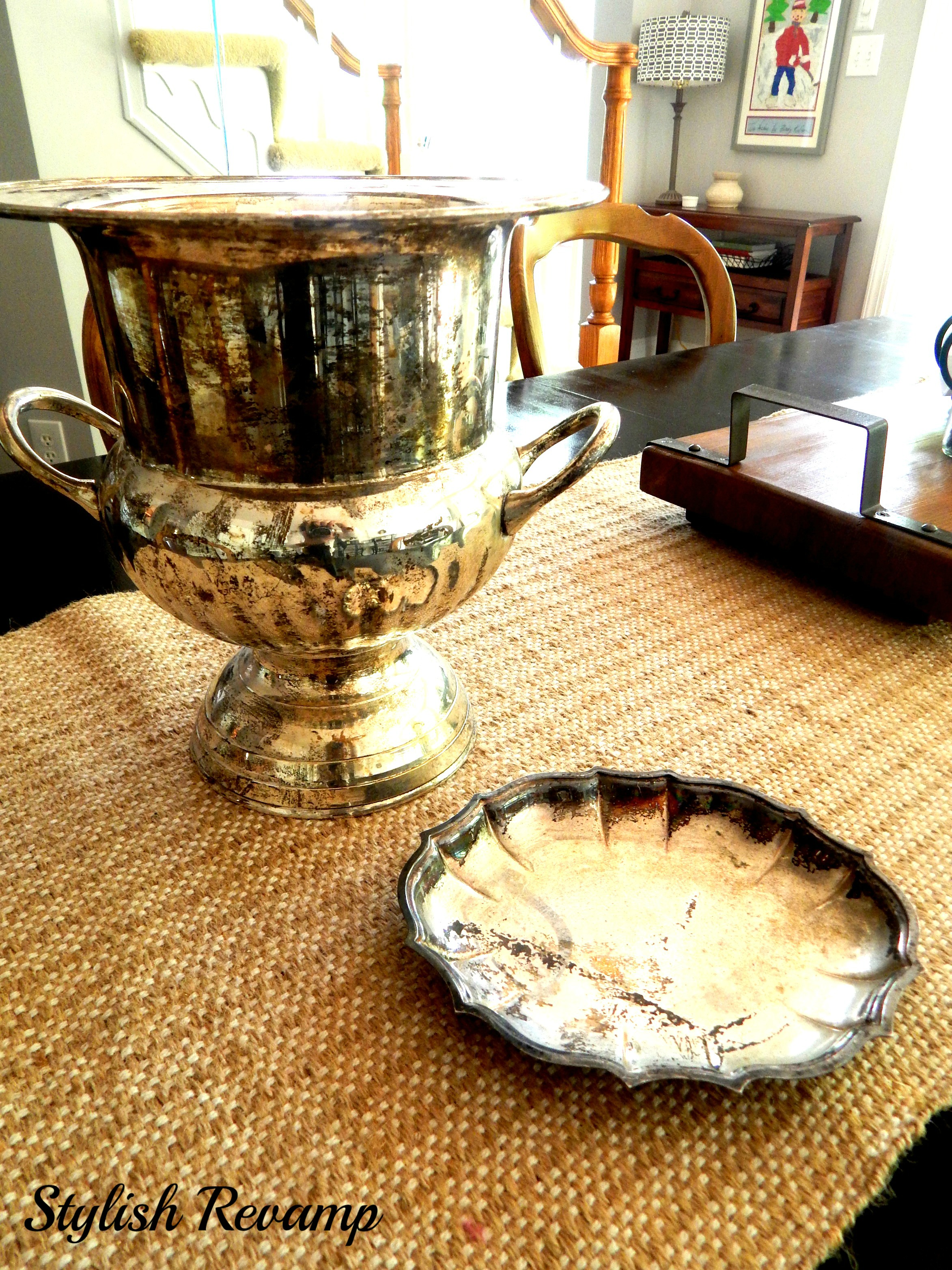 I picked this champagne bucket up at Goodwill. Yes, it still needs polished…alot. Usually, I can just dip my pieces into tarn-x and it comes out clean but I think the pieces I picked up recently are going to need a bit more work. Even with the tarnish, I still think this is such a pretty champagne bucket. It’s a good solid piece.