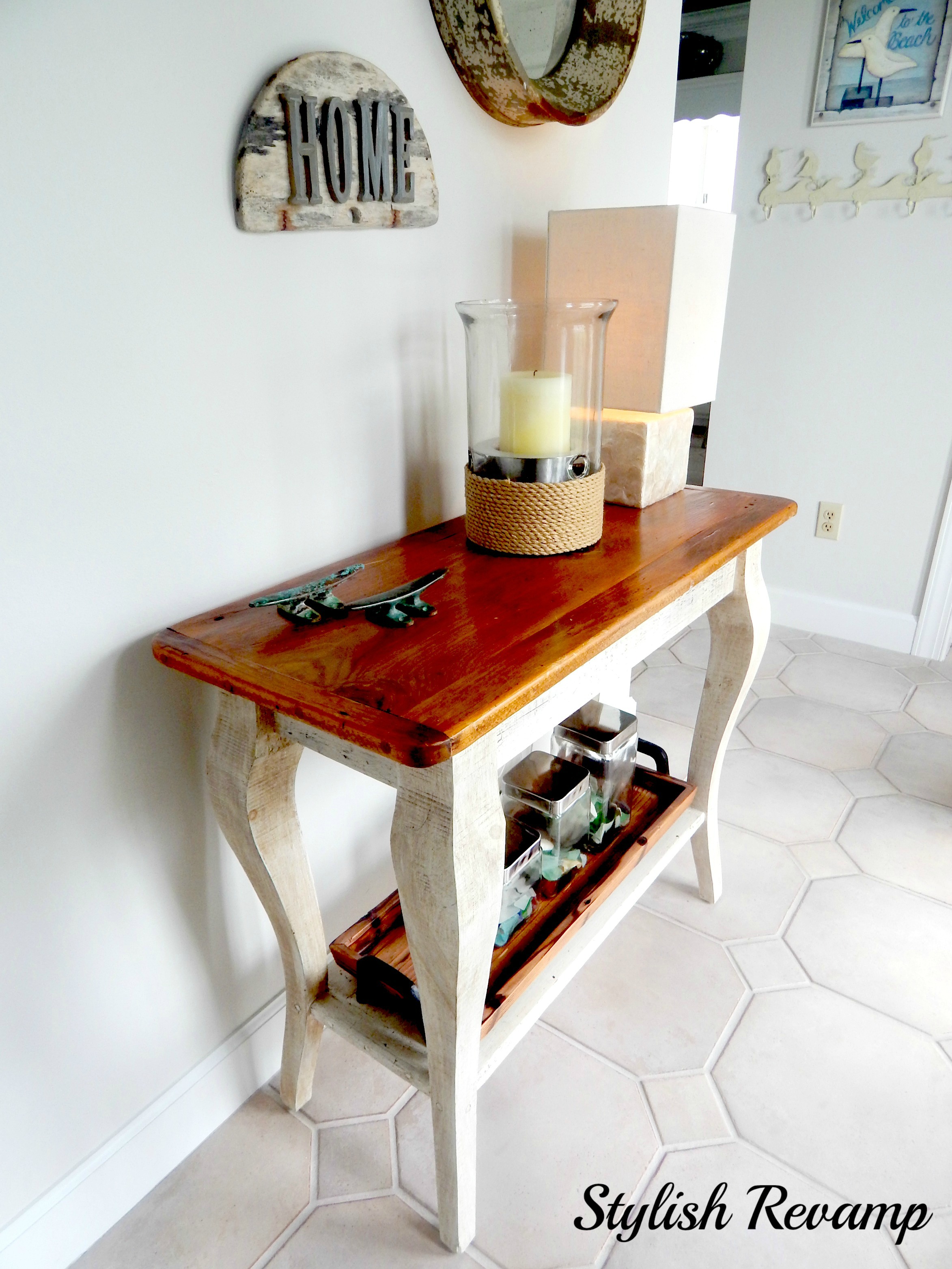 This little table was made using reclaimed barn wood. The top is stained and the body of the table is painted white and finished with a dark wax. Notice the glass jars with the sea glass on the tray on the bottom shelf…another GoodWill find!