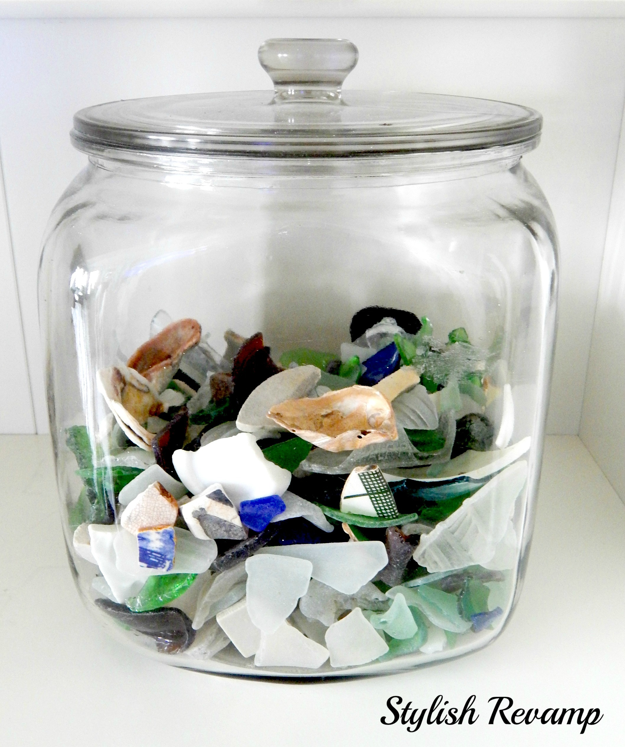 I found this large jar at a consignment store for $5. The sea glass was free minus the labor of paddling over to the shore line to scout it out in the sand.